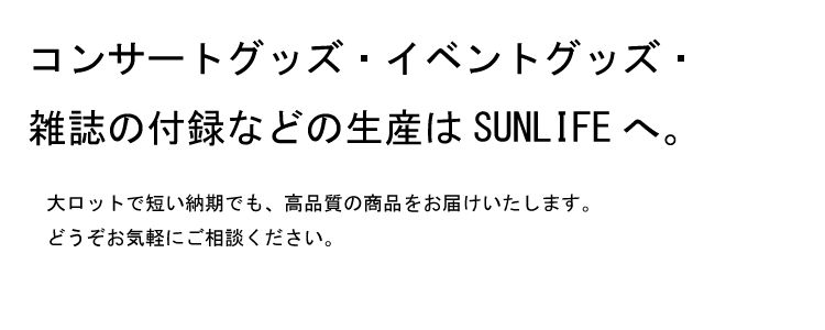 コンサートグッズ・イベントグッズ・雑誌の付録などの生産を行っています。短納期・高品質で、ご指定の場所まで確実にお届けします。